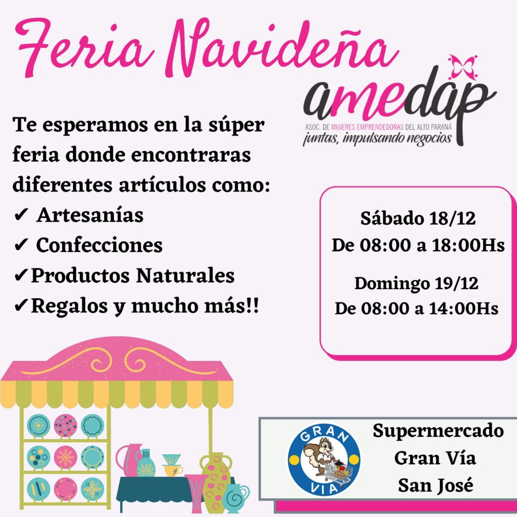 Como ya es costumbre al finalizar el año, la tradicional «feria navideña» de la Amedap se realizará este sábado 18 de diciembre a partir de las 7 hasta las 18 hs y domingo 19 de diciembre de 8 a 14 hs en el Supermercado Gran Vía San José